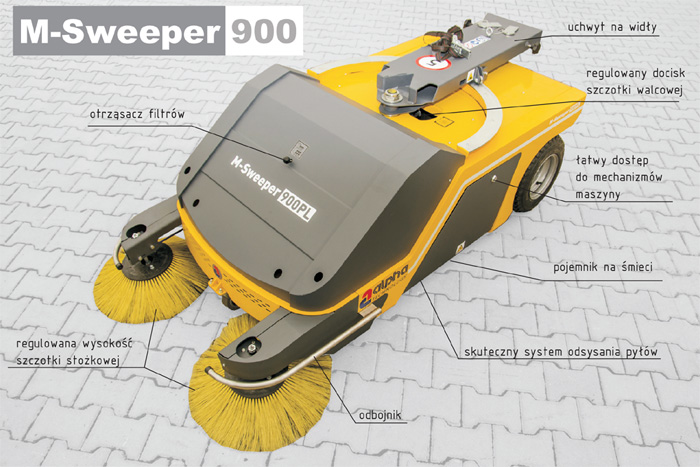 Uniwersalna zamiatarka mechaniczna Sweeper jest urządzeniem polskim produkowanym przez firmą Alpha Technology. Można ją stosować zarówno w halach magazynowych i produkcyjnych jak i na zewnątrz. Urządzenie można podłączyć do każdego typu wózka widłowego. W zbiorniku zastosowano system odsysający jak i filtrujący pył. Opróżnianie pojemnika odbywa się najazd nad kontener i zwolnienie dźwigni.
