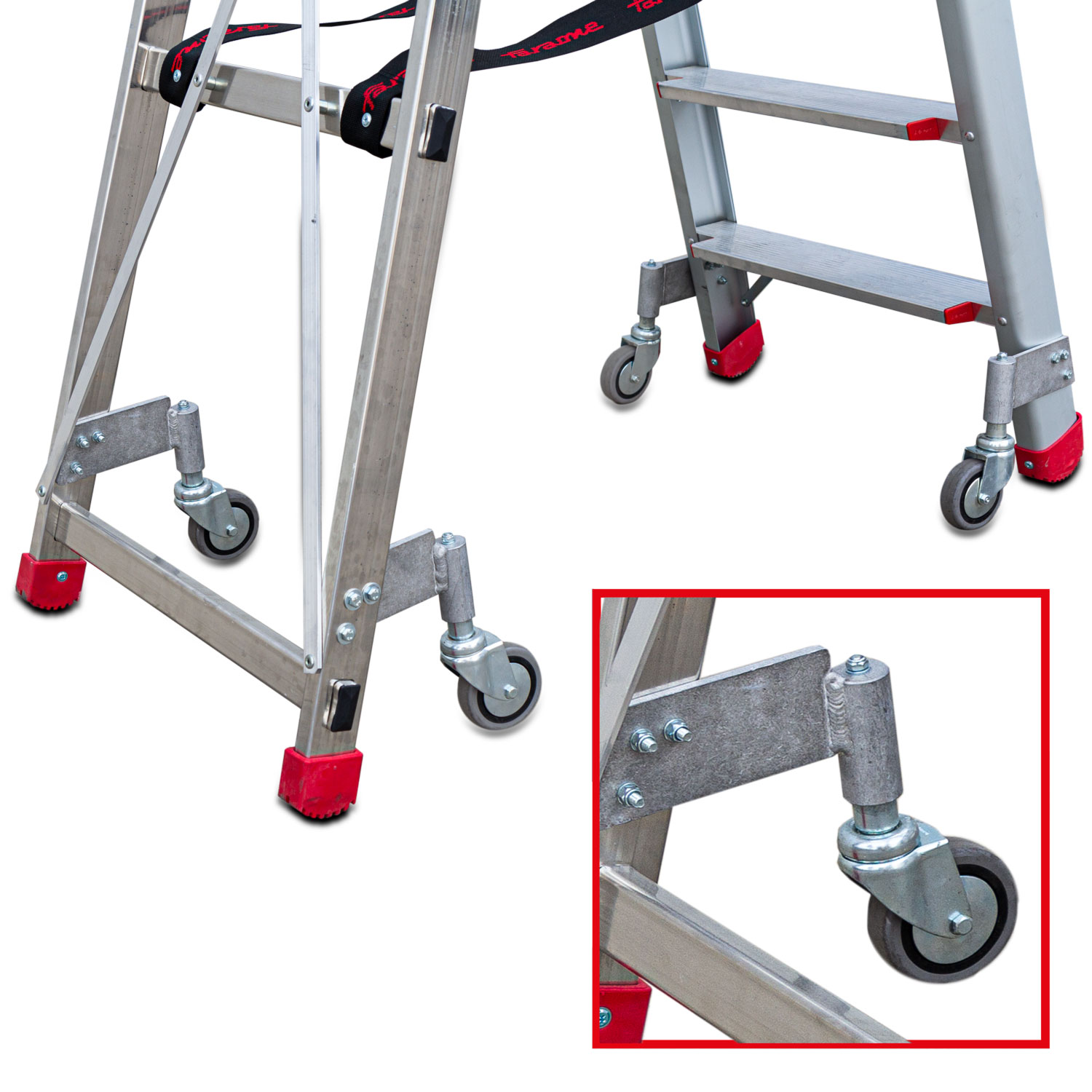 Profesjonalne drabiny aluminiowe, które dzięki zastosowaniu specjalnych profili, posiadają zwiększoną sztywność. Stopnie z profilami antypoślizgowymi. Lotniczy styl mocowania stopni bez spawania. Rowkowane zaślepki z tworzywa zabezpieczają końce drabiny przed poślizgiem i nie niszczą podłogi. Drabiny posiadają europejski certyfikat EN 131. Drabina wyposażona jest w wygodną torbę na narzędzia. Wysokość poręczy 63 cm.