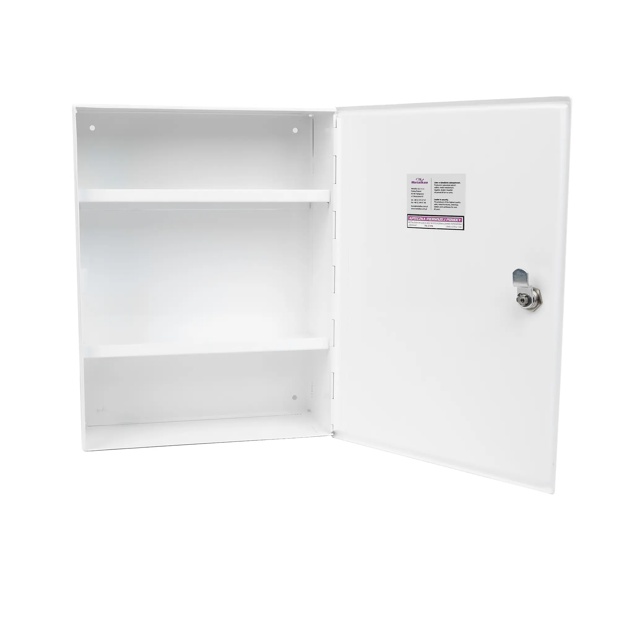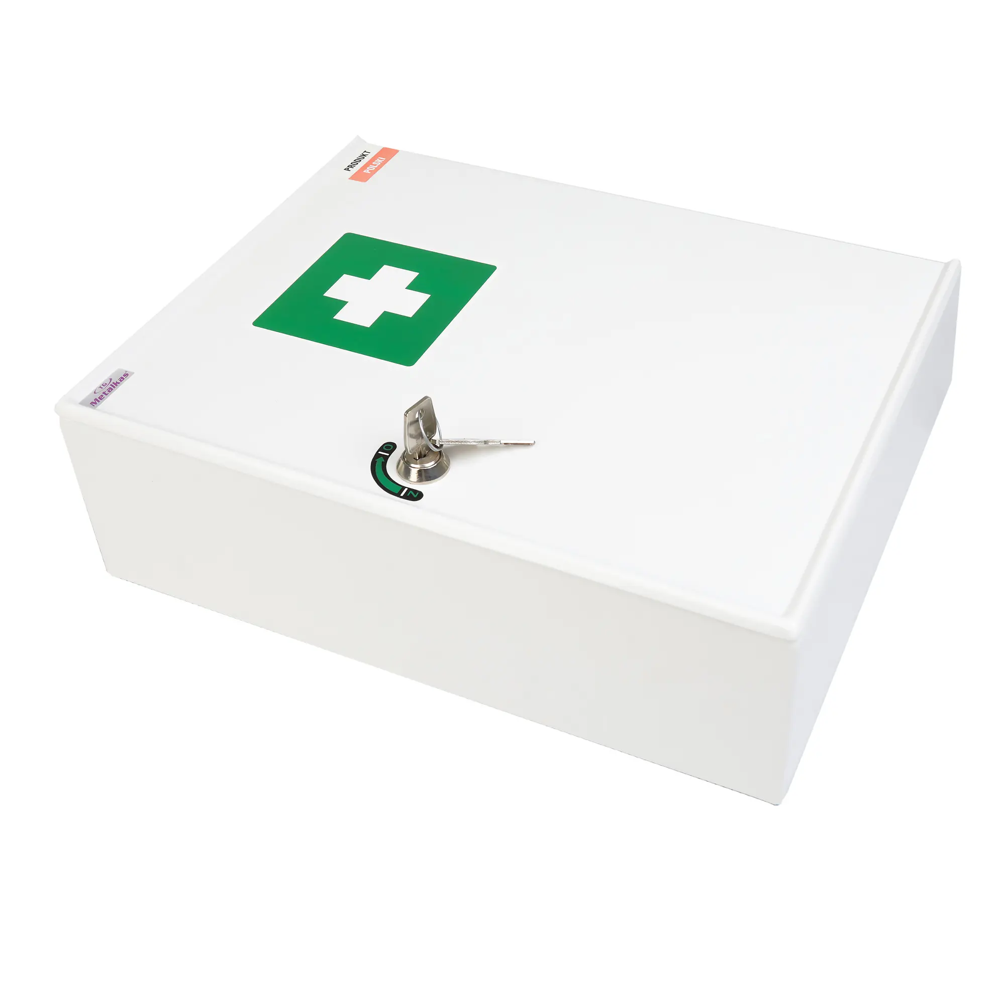 Apteczka metalowa z oznaczeniem zgodnym z przepisami.