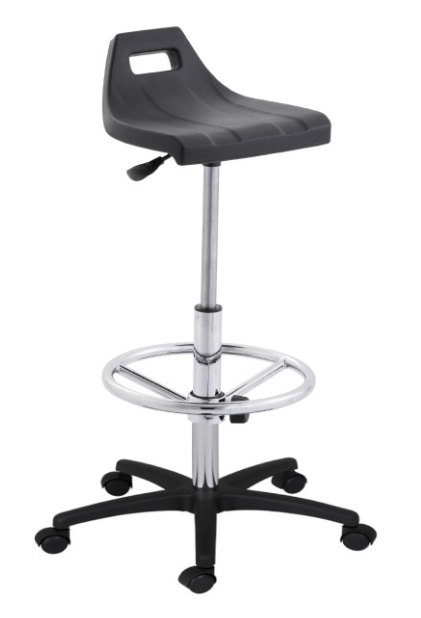 Wysoki, obrotowy hoker stworzony do laboratoriów i warsztatów łączy komfort, stabilność i ergonomię. Profilowane, antypoślizgowe siedzisko z poliuretanu zapewnia wygodne podparcie pleców i jest odporne na uszkodzenia mechaniczne, działanie chemikaliów oraz środki dezynfekujące.
