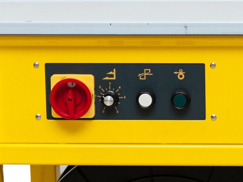 Urządzenie wyposażone jest w stabilny, stalowy stół roboczy oraz wytrzymałą konstrukcję osadzoną na czterech skrętnych kółkach, co umożliwia łatwe przemieszczanie wiązarki w obrębie stanowiska pracy. Wbudowany podajnik taśmy oraz intuicyjny panel sterowania pozwalają na prostą obsługę i szybkie dostosowanie siły naciągu taśmy do pakowanego towaru.