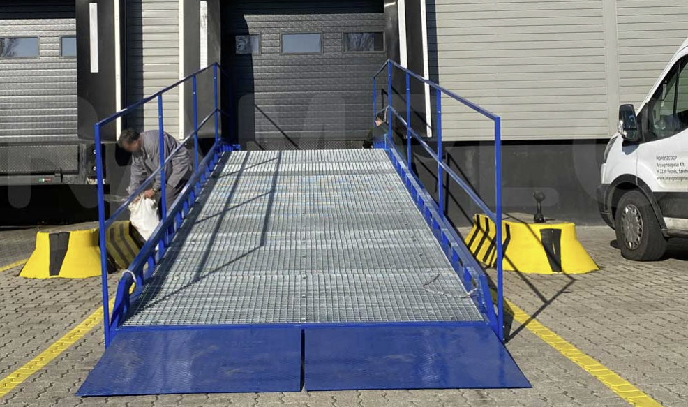 Rampa stacjonarna nie wymaga montażu. Dostawia się ją do magazynu i konstrukcja jest na tyle ciężka i samonośna, że nie wymaga dodatkowego kotwienia. Istnienie możliwość dołożenia do rampy blachy z otworami na śruby i dokręcenia rampy (czołowo) do betonowej strony magazynu, też można zabetonować nogi albo je dokręcić do posadzki, natomiast nie jest to konieczne.
