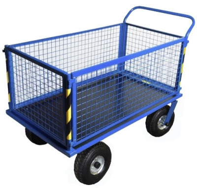 Wózki osiatkowane umożliwiają wygodny transport drobnych towarów. Burty siatkowe mają wysokość 520 mm. Boczne burty są łatwo demontowalne. Wszystkie elementy stalowe malowane są lakierami proszkowymi. Podłoga wykonana jest z wodoodpornej i antypoślizgowej sklejki impregnowanej. Koła polskie – łożyska wałeczkowe, czarna opona.