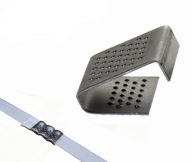 metalowe zapinki blaszane perforowane – idealne do taśm stalowych, gwarantują bardzo mocny zacisk i pewne unieruchomienie ciężkich ładunków,
